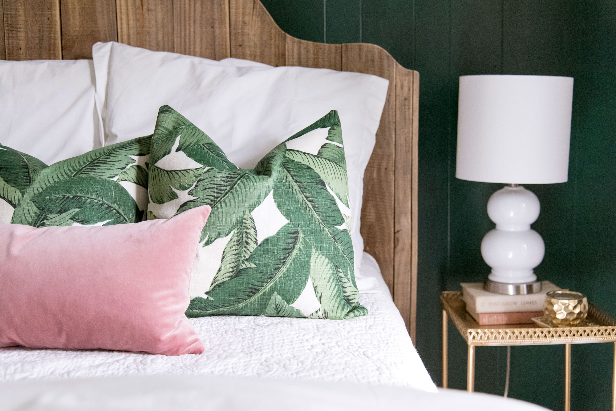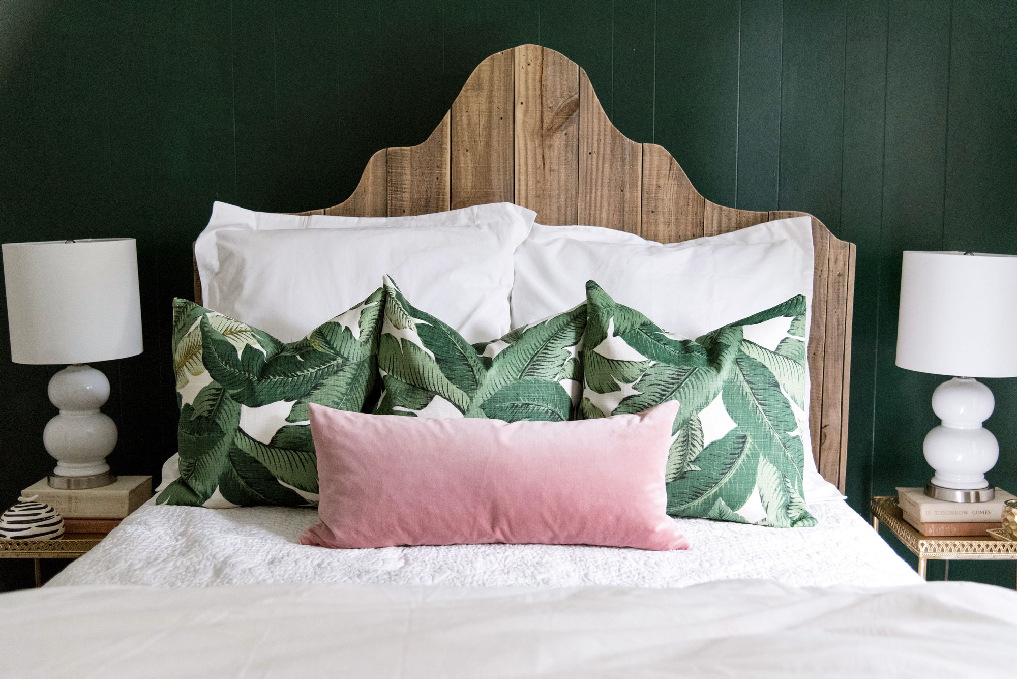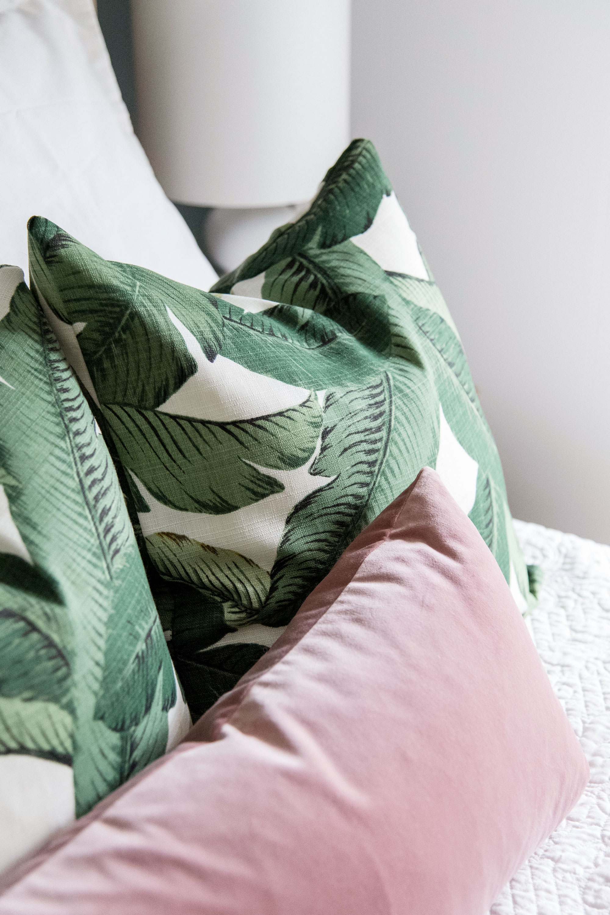 There are so many ways to arrange pillows on your bed but I’m a sucker for symmetry and odd numbers. I chose two euro shams that match the duvet (this is a full sized bed) and 3 18″ throw pillows in this super fun palm print from Live Love Smile on Etsy. I love to switch up my throw pillows so I always suggest that people buy covers for their pillow fillers instead of plain filled pillows. That way you can change the look of your space whenever you want. I finished the look with this blush pink lumbar pillow also from Live Love Smile on Etsy. Her quality is impeccable and her prices are FANTASTIC!!! She has TONS of colors and patterns. Go check her out here.