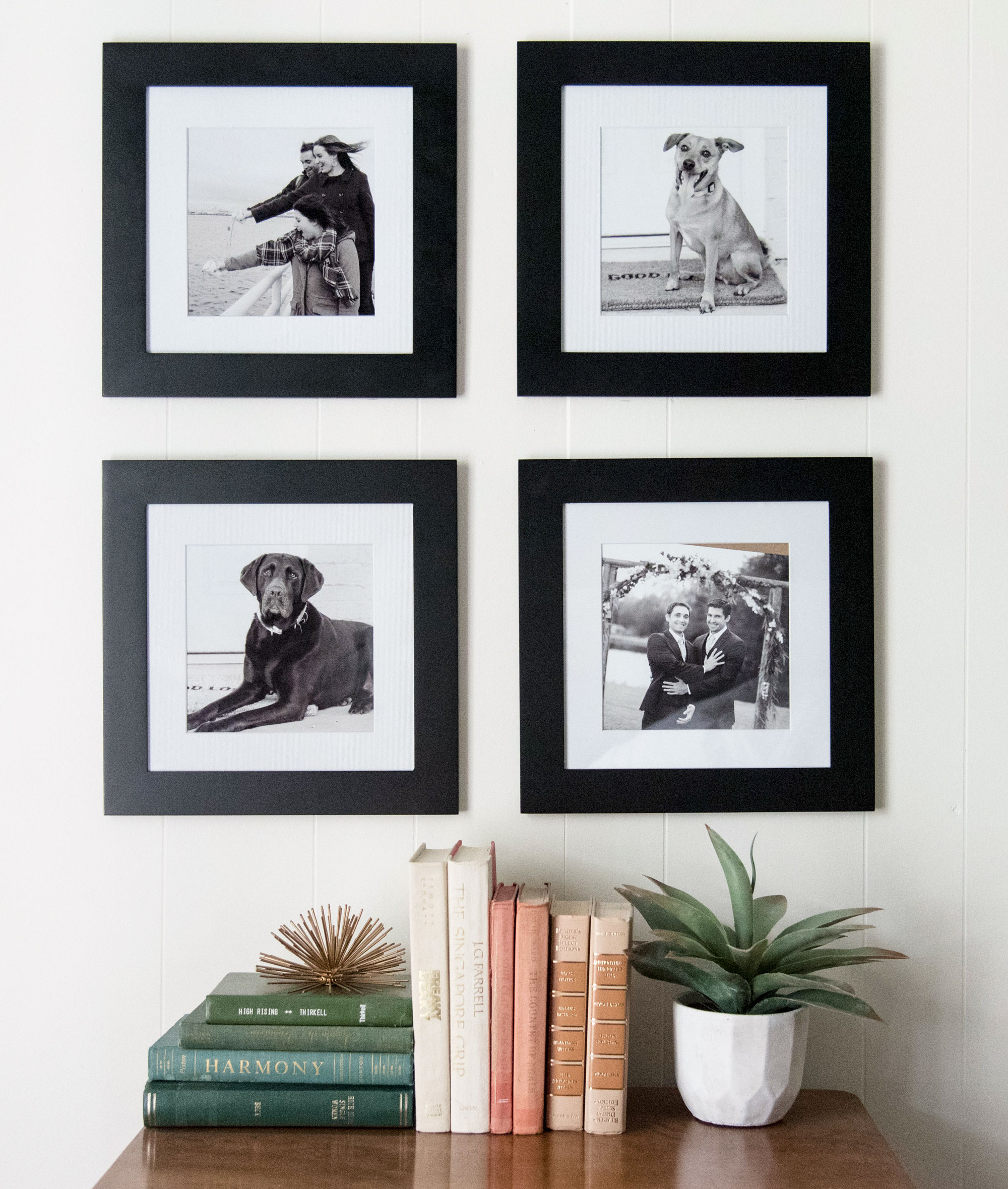 The cute little wooden table you see in the above photos is actually my grandmother’s mid-century sewing machine. It still works and I use it constantly. When not in use, it provides the cutest little catch-all table for my guests to store their stuff. I’m planning to get a little mirror on a stand for ladies to do their makeup since my guest bath doesn’t have much counter space. Above it, I chose to hang 4 12″ x 12″ frames with black and white images of some of our frequent visitors and our pups! We love looking at these fun pics of Keith, Elizabeth and I pouring tea into the Boston Harbor (basic, much?) and an awkward exchange between Keith and Tim (his bestie for the restie) at our wedding! It creates a little gallery wall without being too crowded. Plus, symmetry… I love symmetry.
