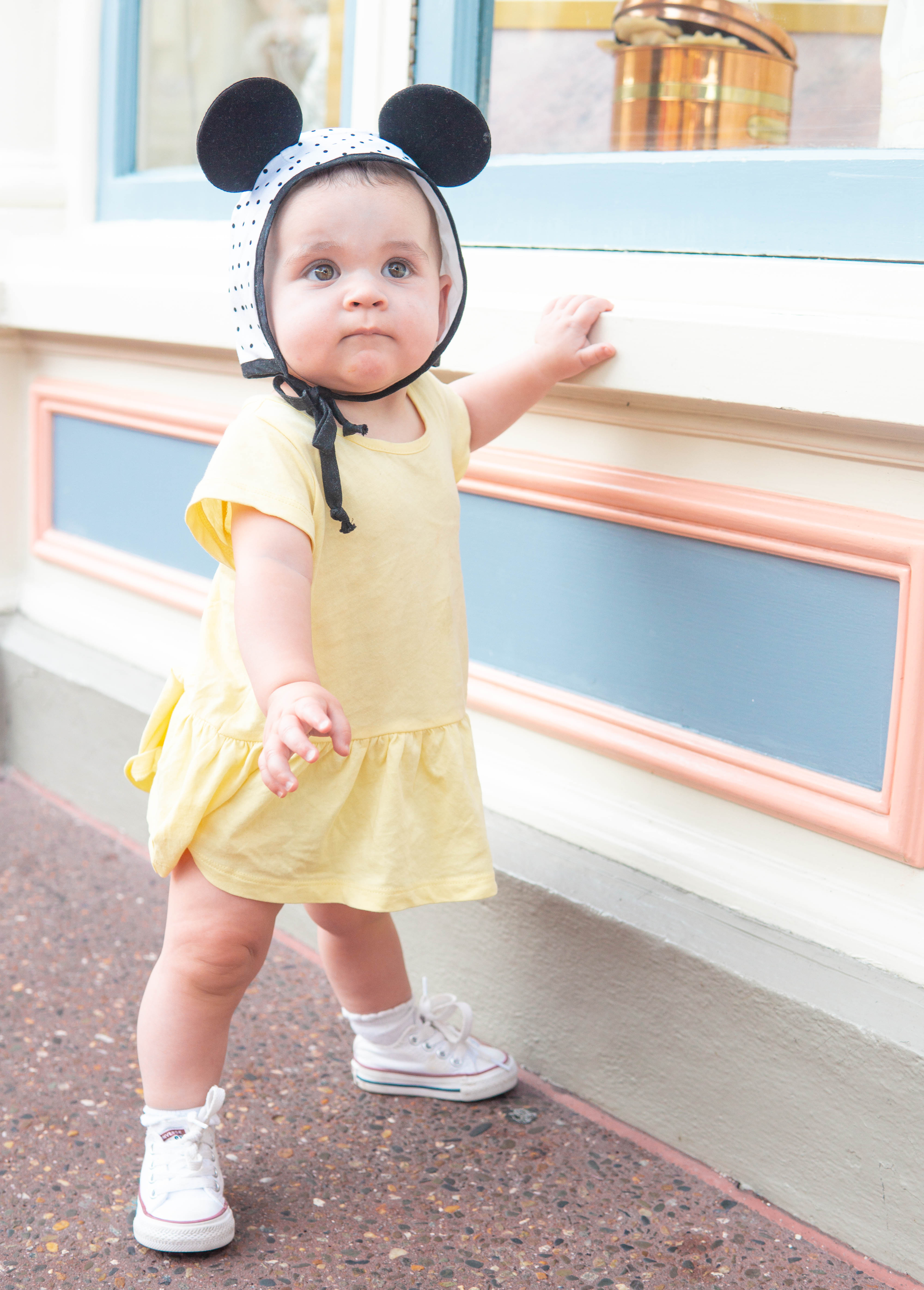 Kate’s Yellow Ruffle Dress | Striped Bloomers | Mickey Bonnet | Converse