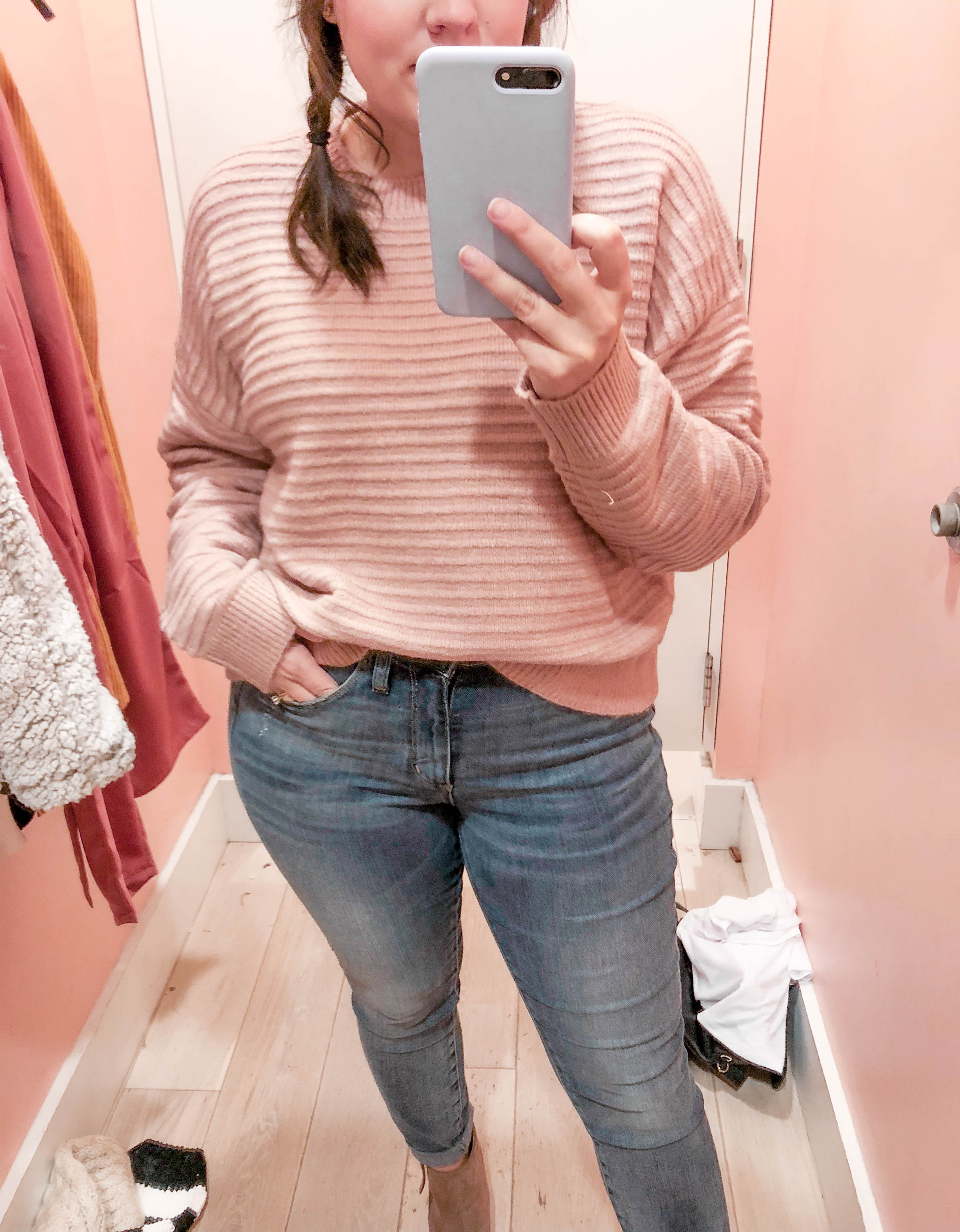 Mauve Ribbed Sweater (kind of cropped) – Wearing a Large – Size Up for oversized look.
