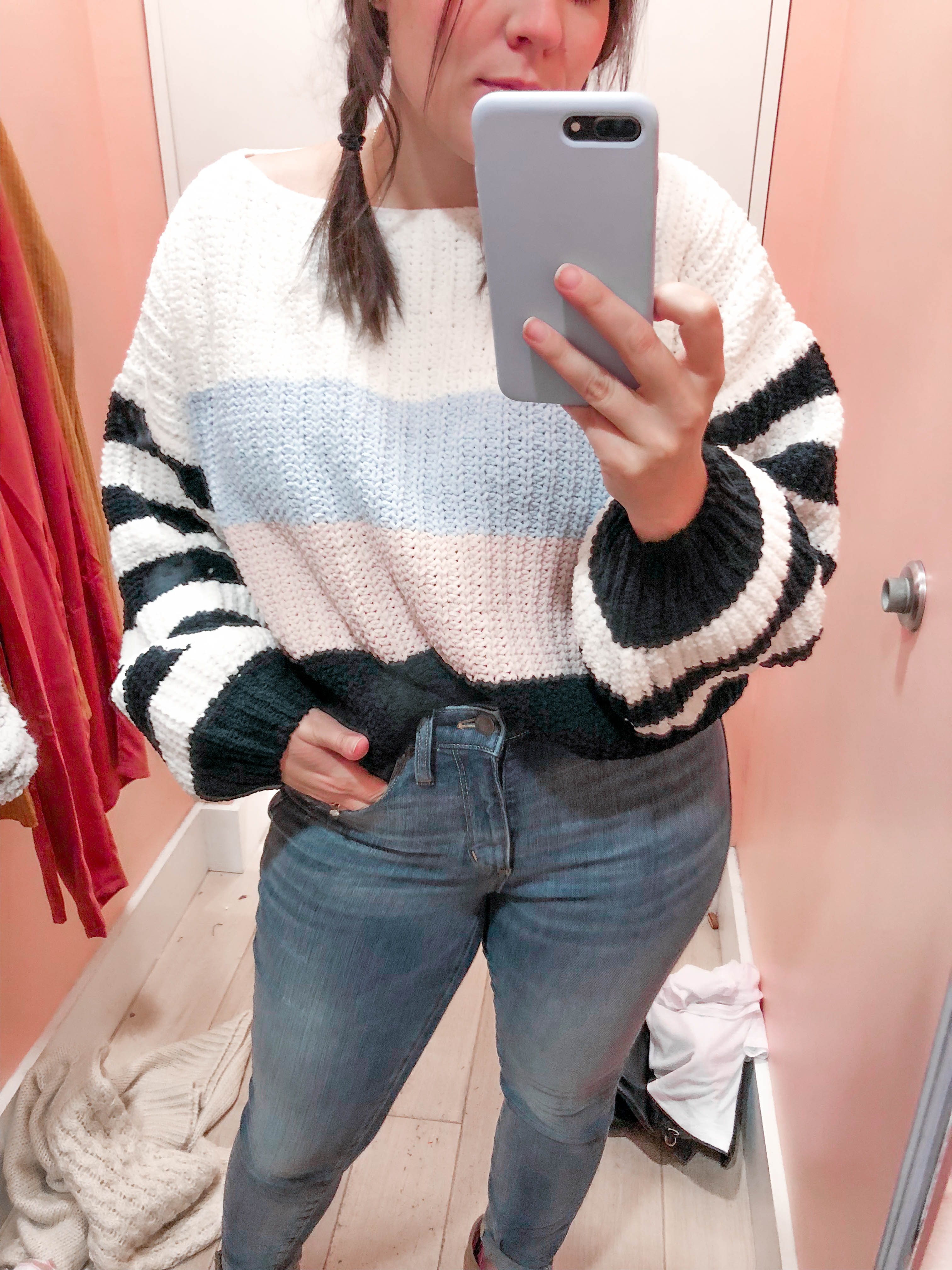 Chenille Color Block Sweater – Wearing A Small – TTS for oversized fit.
