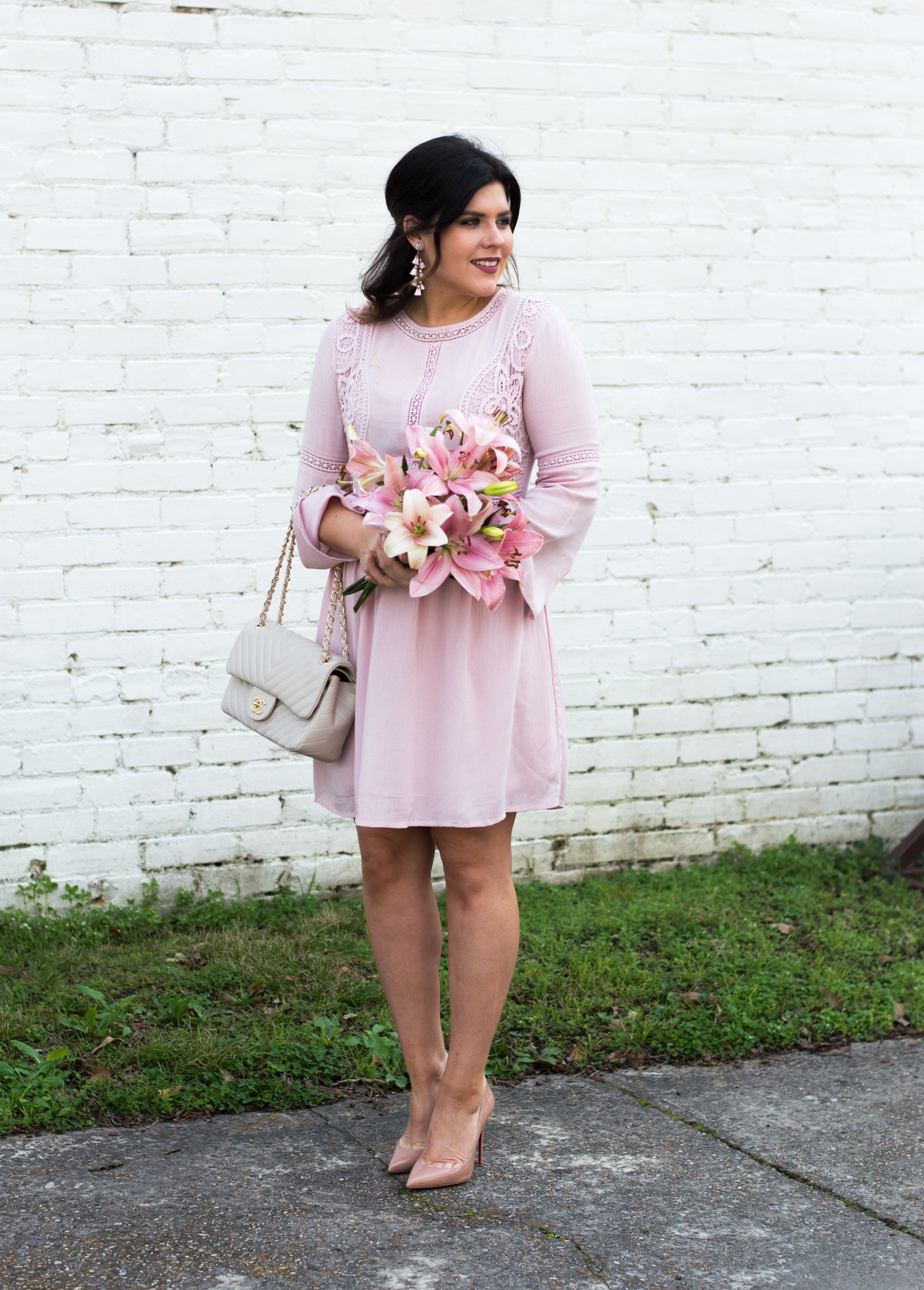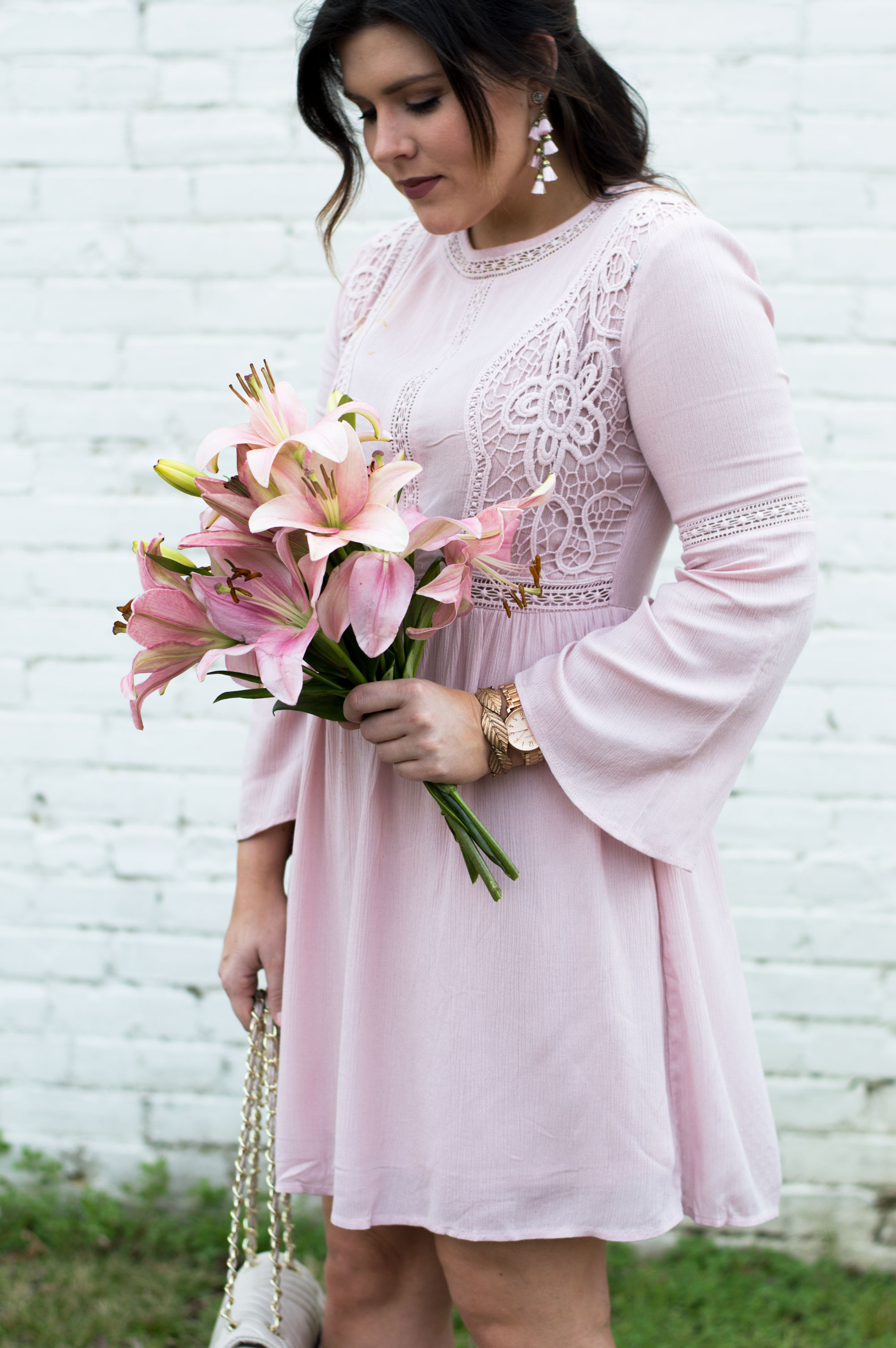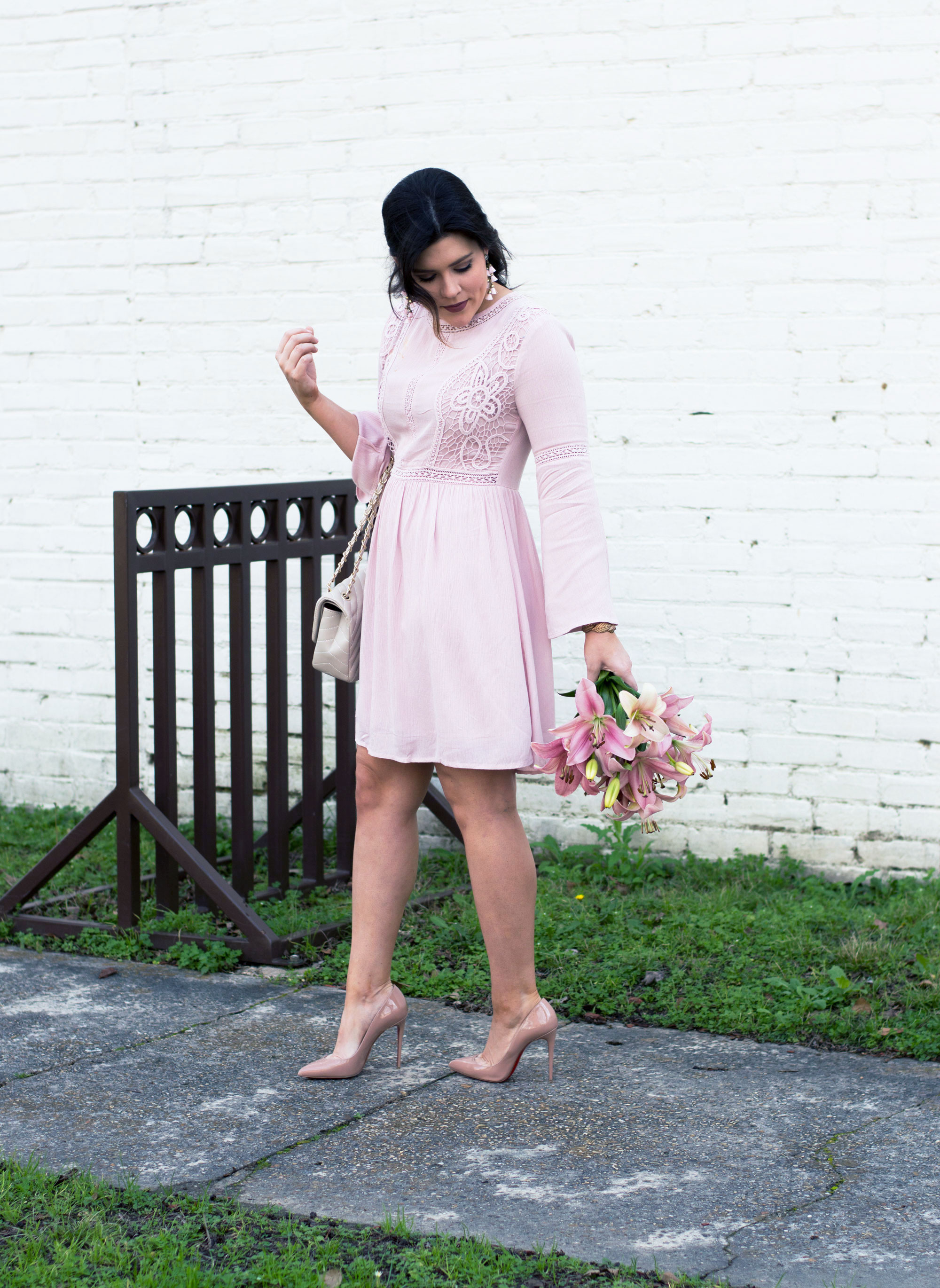 I’m so excited to share today’s look with you all! I’ve teamed up with one of the LARGEST online boutiques, Mint Julep, to give you a really sweet Valentine’s Day outfit. Not sure yet what my Valentine’s Day plans are but I know they will include this perfect, barely pink, bell sleeve number.